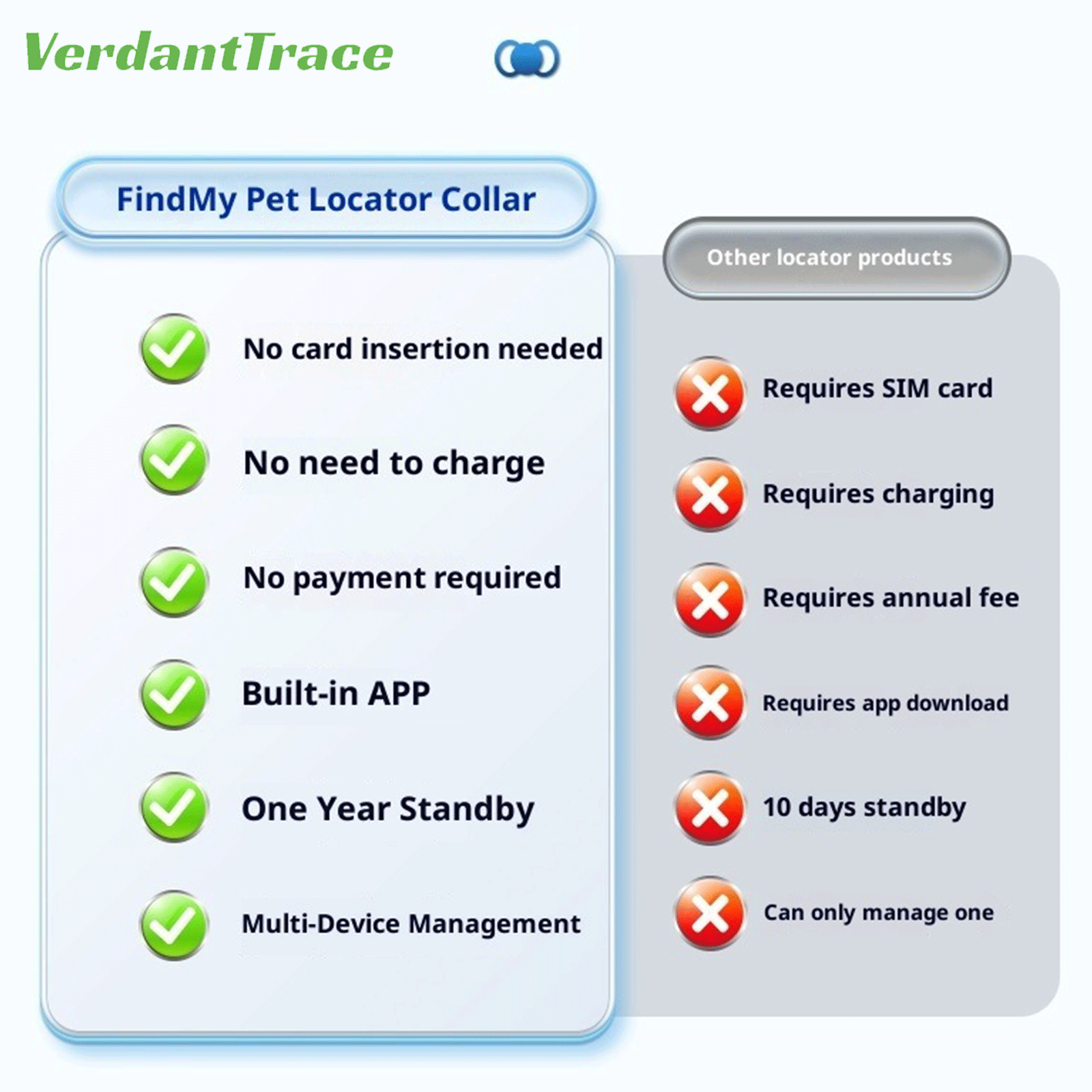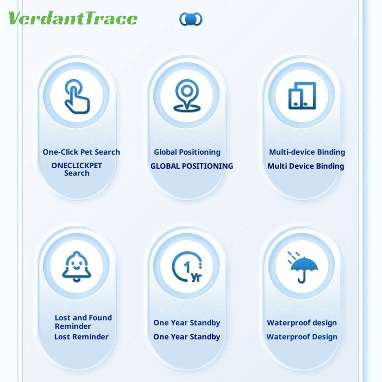 Keep your pets safe and easy to find. The VerdantTrace VTF25 Smart Pet Collar Tracker combines a sleek, durable ABS and silicone build with reliable Bluetooth tracking technology.